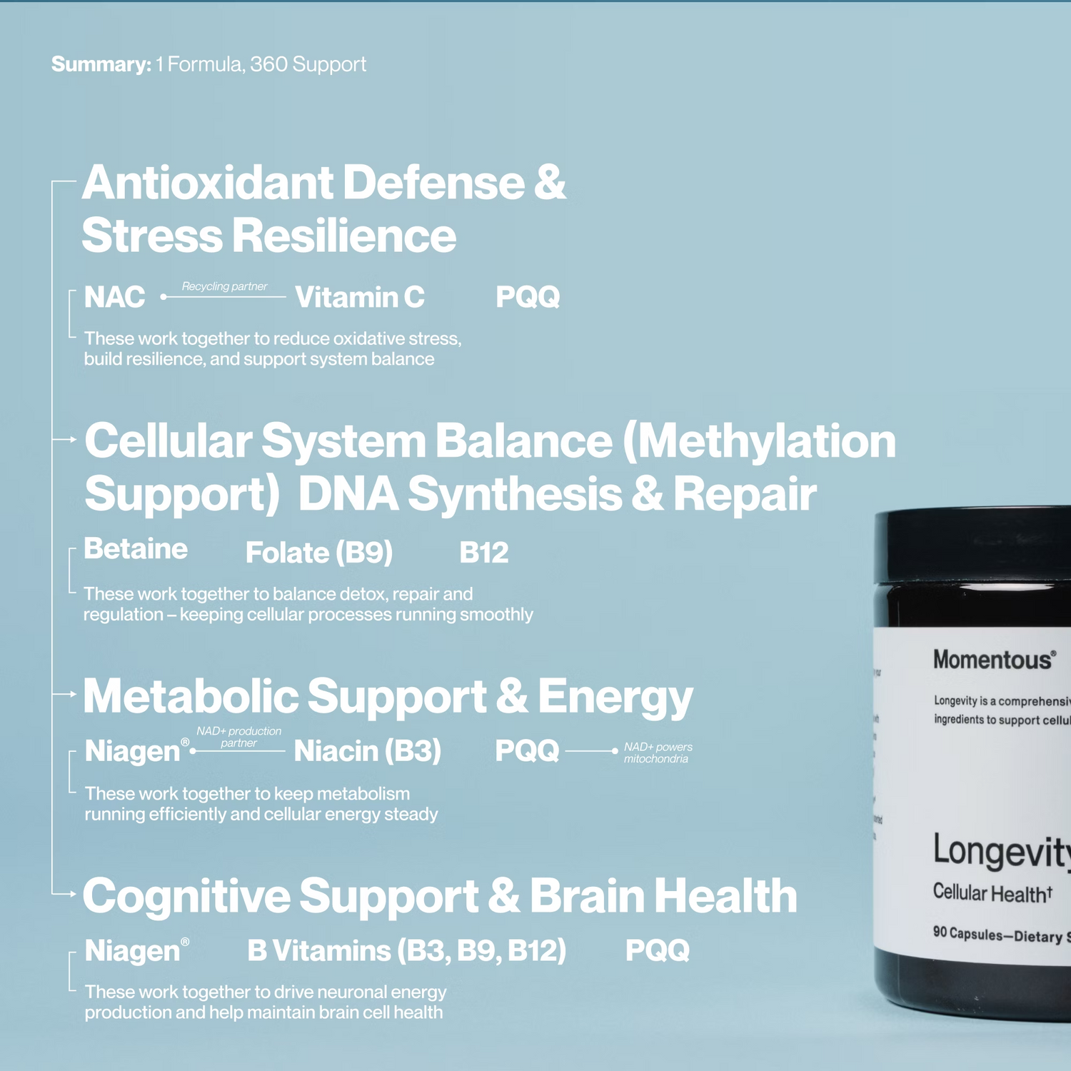 Designed to go beyond NAD⁺ support. Momentous Longevity powers cellular energy, strengthens resilience, supports DNA repair, and promotes long-term performance.